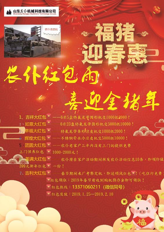 為迎接2019金豬年的到來,讓更多的朋友用上農(nóng)仆涼皮機(jī);山東農(nóng)仆機(jī)械科技有限公司現(xiàn)隆重推出七重購機(jī)大紅包,手慢無——